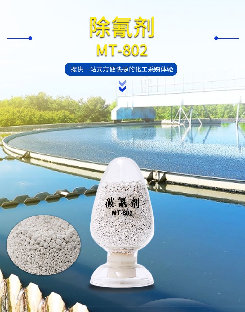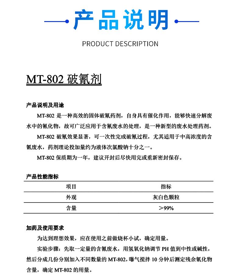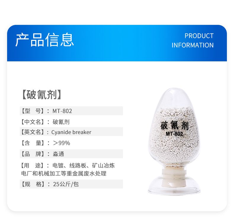 MT-802是一种高效的固体破氰药剂,自身具有催化作用,能够快速分解废水中的氰化物,故可广泛应用于含氰废水的处理,是一种新型的废水处理药剂。
